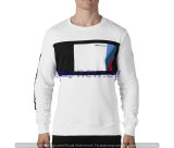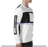 Мужской свитер из коллекции BMW M MOTORSPORT, весна 2019 года. Визуальные детали в виде цветных блоков. Основной цвет спереди - белый. На груди черный и белый блоки с цветными полосами BMW M и надписью BMW M Motorsport Черная спинка. На правом рукаве в блоке контрастного цвета напечатан логотип BMW M Motorsport. На левом рукаве цветная эмблема BMW. Круглыи? вырез горловины, рукава и пояс с манжетами в рубчик 2 ? 2. Материал: 83% хлопок, 17% полиэстер. Цветовая комбинация: черныи? / белыи?.
